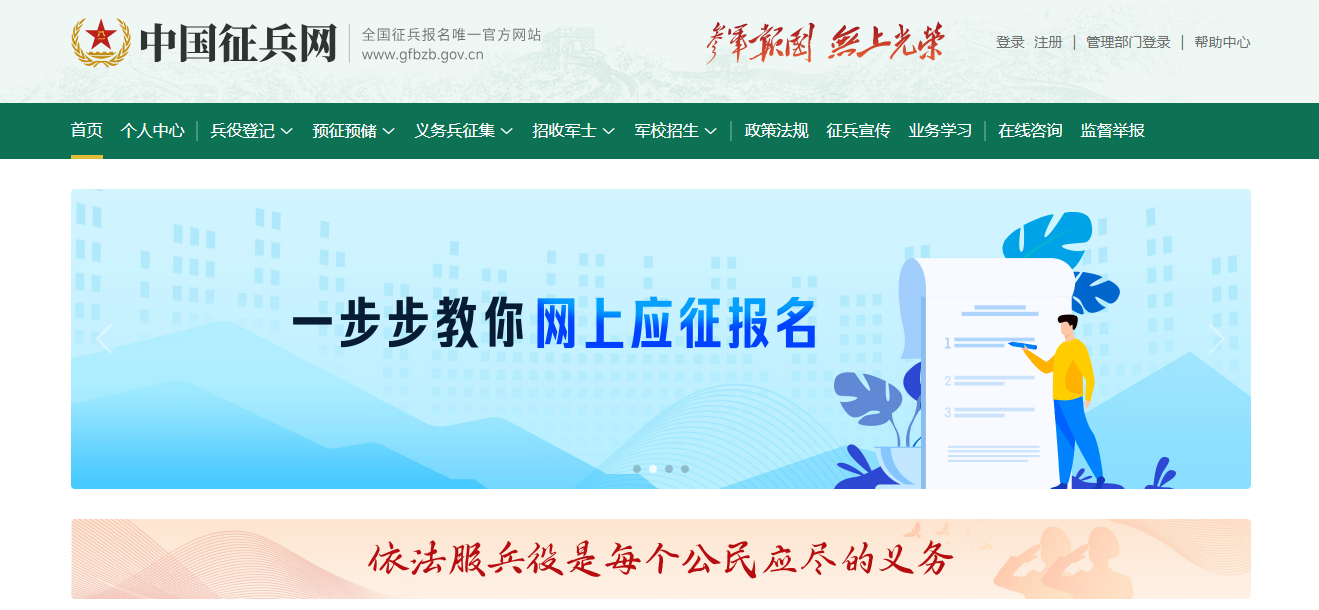在中国征兵网(https://www.gfbzb.gov.cn/)首页,点击“ 兵役登记 ”;