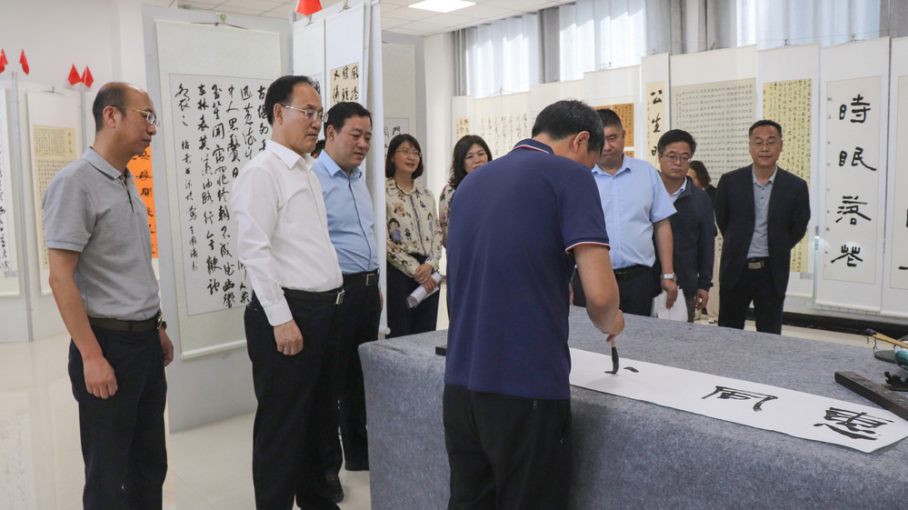 最后,郭明维宣布学院“奋进新征程·翰墨颂华章”暨廉洁文化进校园师生书画作品展正式开展;大家一起参观了展览。