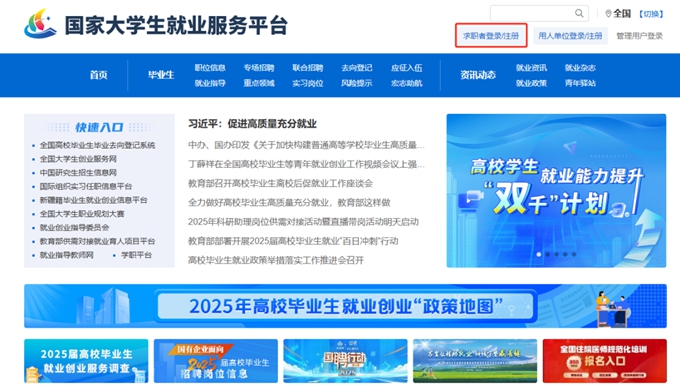 第一步:访问国家大学生就业服务平台网站(https://www.ncss.cn/),点击首页右上方“求职者登录/注册”,进入用户页面,点击“立即注册”,填写注册信息,并点击立即注册,账号即可注册成功。或搜索并关注平台微信公众号“ncssfwh”,登录学信账号,获取求职应聘、就业指导等服务。